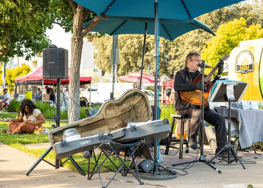 There will be up to 30 vendors at the 2026 Farmers’ Market, including San Leandro’s Hummus Heaven and newly located in San Leandro, Roli Roti rotisserie chicken. Popular vendors JC’s Holey Donuts, J&M Farms, Bodega Trading Company, Dumpling King, and Toshi’s Teriyaki Grill will be returning to the market, among several others. Live music will return on a weekly basis, coordinated by the Pacific Coast Farmers’ Market Association.